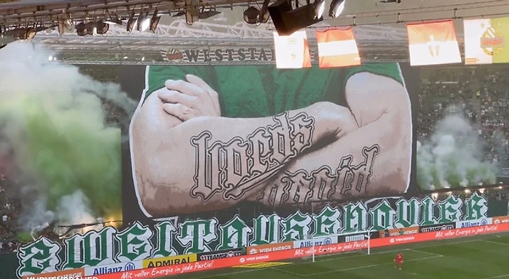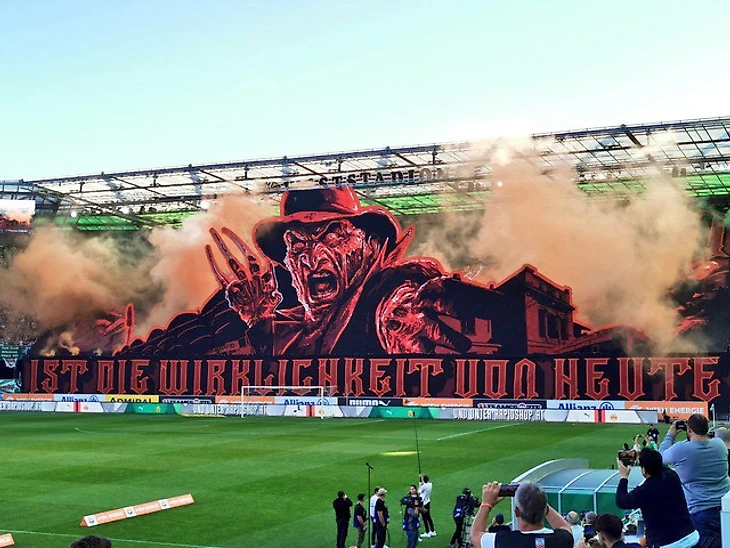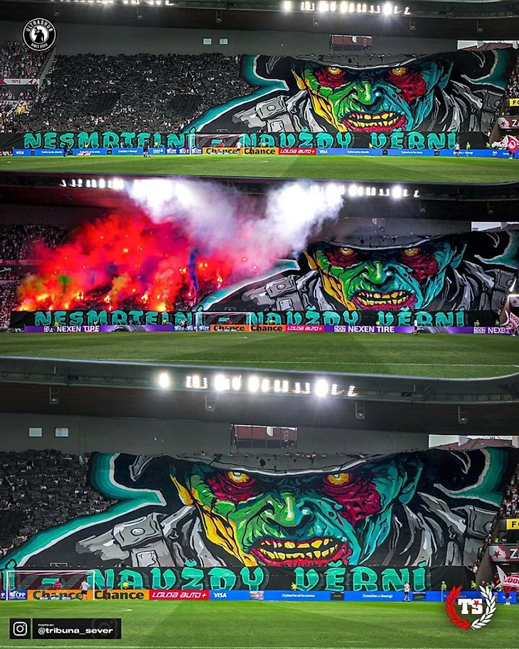 Я не разбираюсь в фильмах ужасов, поэтому так и не смог однозначно идентифицировать персонажа с баннера чешских фэнов — то ли это Джиперс Криперс из одноименной серии фильмов ужасов, то ли это гораздо более попсовый вариант в виде Фредди Крюгера (если вы шарите в этом, то отпишитесь в комментариях). Если все-таки второй, тогда мы можем плавно переместиться в качестве постскриптума на дерби Вены между «Рапидом» и «Аустрией», где ультрас «Рапида» развернули мощный перфоманс «Это реальность сегодняшнего дня» со все тем же Крюгером в главной роли.