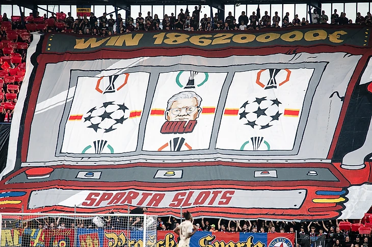 На фанатском баннере был изображен типичный игровой автомат, принцип работы которого максимально прост: игрок делает ставку (опускает в аппарат заранее купленный жетон либо купюры), дергает за рычаг и ожидает, какая комбинация выпадет на экране. Если комбинация окажется выигрышной — игрок срывает джек-пот, если же нет — деньги полностью «сгорают», оставаясь в заведении. Ультрас «Спарты» свой джек-пот получили — у них на экране выпала комбинация из двух мячей Лиги Чемпионов (такой же изображен на логотипе турнира), а также портрет нового тренера команды Ларса Фрииса. Датчанин минувшим летом сменил на этом посту своего соотечественника Брайна Приске, который в прошлом сезоне сделал золотой дубль (сезоном ранее он также привел «Спарту» к золотым медалям чемпионата) и до 1/8 финала Лиги Европы, где только «Ливерпуль» смог остановить пражский клуб. Теперь Приске ушел на повышение в «Фейенорд», чей коуч Арне Слот отправился на «Энфилд», ну а на смену Брайану пришел Фриис, который лишь 1,5 сезона проработал на родине в качестве главного тренера, до этого трудясь помощником в нескольких клубах (но в «Митьюлланде» пробыл аж 16 лет!).