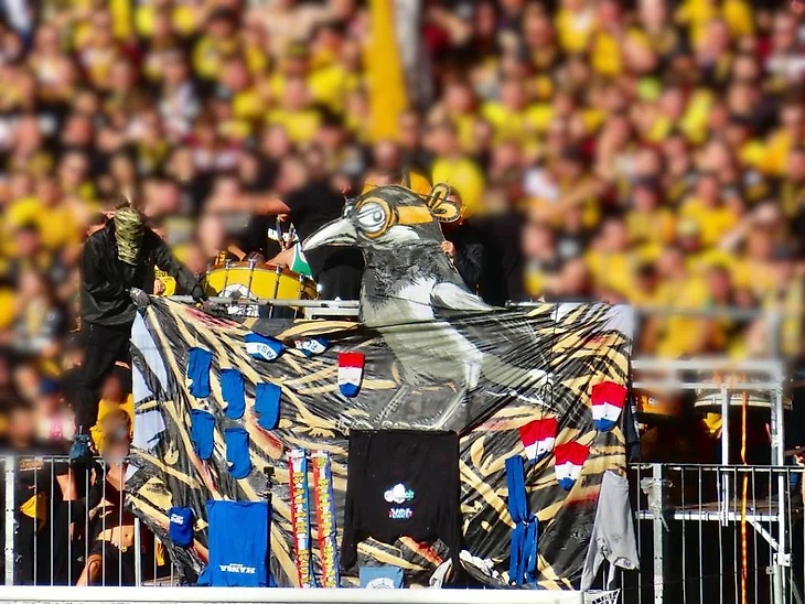 Дрезденцы ответили креативной демонстрацией отжатой атрибутики фанантов «Ганзы» — шарфов, футболок, толстовок, масок, флажков и так далее. Все это бережно «хранилось» в импровизированном птичьем гнезде, но в целом трофеев было настолько много, что бОльшую часть из них просто вывесили на решетке вдоль фанатской трибуны. Позднее, разумеется, все это было сожжено.