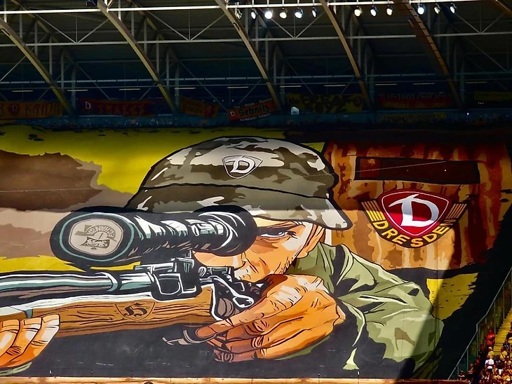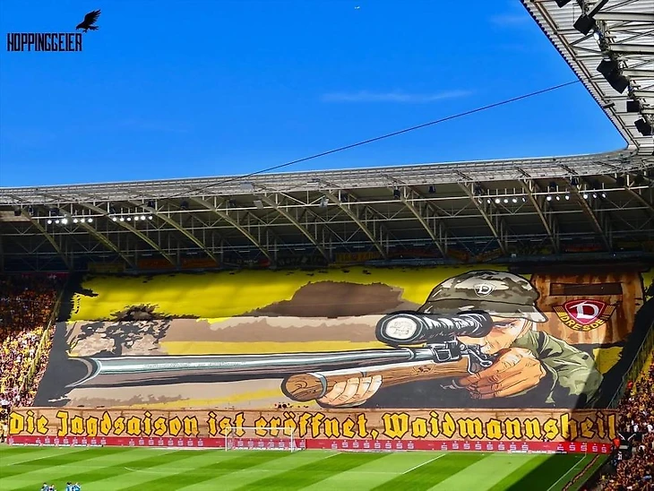 Переместимся в 3-ю лигу Германии и посмотрим на матч двух команд, фанаты которых частенько появляются на страницах данного блога — это дрезденское «Динамо» и «Ганза» из Ростока. К данной игре клубы подошли на разных полюсах турнирной таблицы — дрезденцы шли в группе лидеров и боролись за 1-е место, тогда как «Ганза» бесславно болталась на последней строчке, уступая даже дублю «Ганновера». Тем не менее данное противостояние является очень жарким в первую очередь с фанатской точки зрения и именуется Восточным дерби, поэтому ультрас «Динамо» к этой игре подготовили шикарное хорео «Сезон охоты открыт, удачной охоты!», где фанат «Динамо» в образе охотника стреляет из винтовки в сторону гостевой фанатской трибуны с болельщиками «Ганзы». То, что он стреляет именно в них, можно понять не только по направлению винтовки (гостевой фанатский сектор на стадионе «Рудольф Харбиг» расположен на углу противоположной заворотной трибуны), а также по эмблеме «Ганзы», отражающейся в ее прицеле. Для звукового сопровождения такого перфа местные фанаты использовали около 20 петард, взрывы которых символизировали выстрелы.