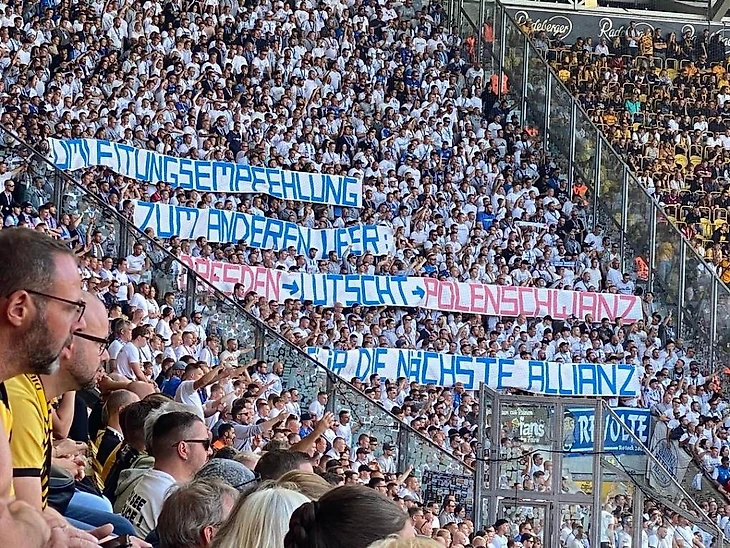Единственной осечкой хозяев стал тот факт, что охотник с их баннера стрелял в пустоту — за несколько часов до начала матча полицией были арестованы 159 фэнов «Ганзы», которые, по мнению полиции, готовились к драке с хулиганами «Динамо». Долгие выяснения истинных причин и переписывания паспортов задержанных привели к тому, что никто из них не успел к стартовому свистку, а привычный заполненный вид гостевой фан-сектор получил лишь ко 2-му тайму. Зато свое появление на стадионе они отметили провокационным баннером «Рекомендация по перенаправлению на другой берег реки: Дрезден сосет польский член для нового альянса» — так фанаты «Ганзы» презрительно высказались в адрес хозяев за их желание наладить контакты с фанатами из соседней Польши, а другой берег реки здесь упоминается в контексте Эльбы, которая протекает в том числе и через Дрезден.