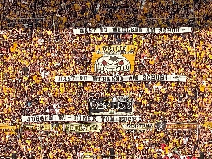 Еще одним тонким подколом в адрес гостей стал баннер «Юрген В. — один из вас!», в котором хозяева глумились над «Ганзой» за то, что генеральным директором клуба является уроженец Дрездена Юрген Веленд, который пару лет назад даже успел поработать коммерческим директором и в «Динамо». Примечательно, что и дрезденские ультрас его невзлюбили — причиной этому послужила инициатива Веленда по созданию игровой футболки клуба в нетрадиционном для клуба синем цвете и обилием рекламы.
