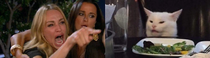 Вторым шел мем с двумя ревущими девушками и подписью «Фанат «Милана», ты сошел с ума!!! Выиграно 6 дерби!!! Никогда не было 8!!! Осталось 2!!!». Этими фразами они отвечали «интеристам», которые до этого матча стебались над красно-черными из-за того, что «Интер» выиграл 6 дерби подряд. В истории миланских дерби еще ни одна команда не выигрывала 8 матчей подряд, о чем мечтали тифози черно-синих. Ну а сам мем появился в 2018 году, когда к изображению двух девушек один из интернет-пользователей добавил фото кота с растерянным выражением морды. Он берет свои корни из реалити-шоу «Настоящие домохозяйки Беверли-Хиллз», где в одной из серий 2011 года участница Тэйлор Армстронг заплакала во время спора, а подруга Кайли Ричардс попыталась ее успокоить.
