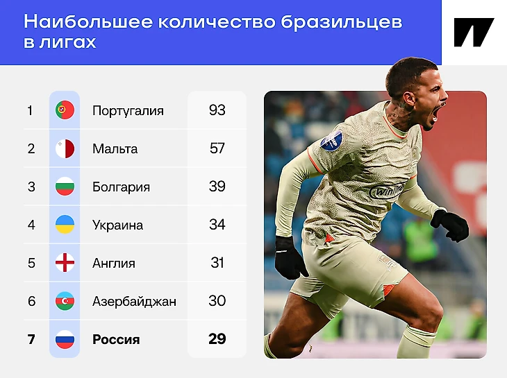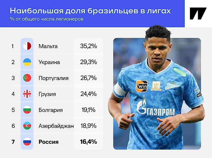 РПЛ в современных реалиях все чаще обращает внимание на бразильский рынок, поэтому и замыкает семерку в Европе и по проценту бразильцев среди всех легионеров, и по их количеству.