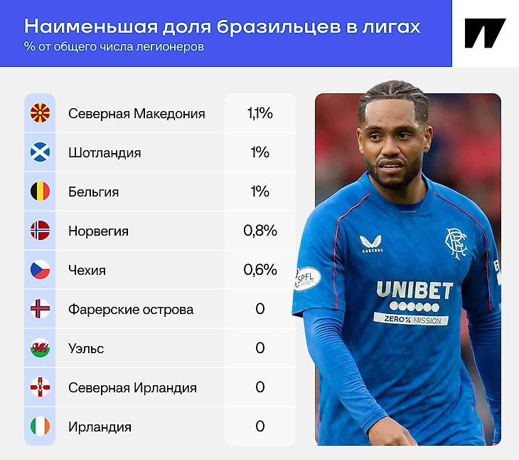Интересно, что из четырех лиг без бразильцев три – в Британии. Очевидно, что одна из причин в строгих нормах выдачи рабочих виз.