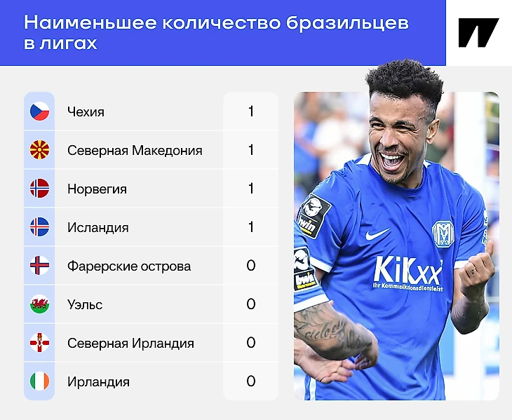 Минимальный процент у Чехии и Норвегии – ниже 1%. Там затаилось по одному бразильцу – в «Пардубице» и «Валеренге».