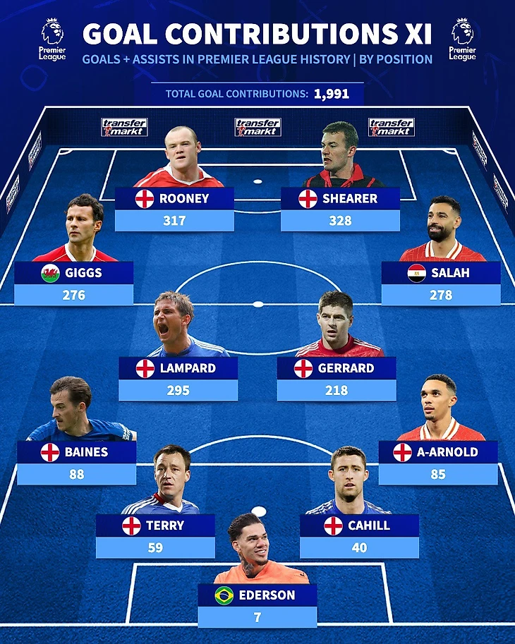 Портал собрал состав из футболистов с наибольшим количеством голевых действий в Премьер-лиге в XXI веке. Уэйна в команде обходит только Алан Ширер, за свою карьеру оформивший 328 по «гол+пас». А Руни в составе «Эвертона» и «Манчестер Юнайтед» совершил 317 результативных действий – 208 голов и 109 ассистов.